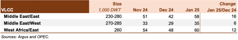 После вялой динамики в конце 2024 года спотовые ставки фрахта для VLCC выросли в январе на всех отслеживаемых маршрутах. В среднем спотовые фрахтовые ставки VLCC выросли на 31 % по сравнению с предыдущим месяцем. Однако рост был недостаточным, чтобы превзойти показатели того же месяца прошлого года. В результате спотовые ставки VLCC снизились на 11 % по сравнению с аналогичным периодом прошлого года.