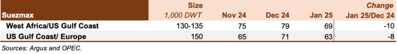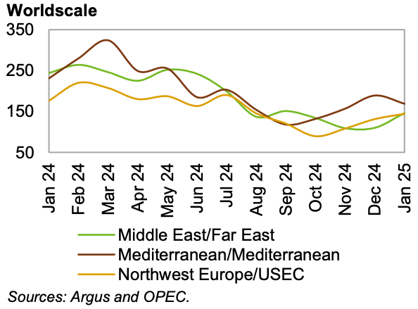 На маршруте Карибский бассейн — ЮСЕК спотовые фрахтовые ставки снизились на 22% за месяц и составили в январе в среднем WS124. По сравнению с аналогичным периодом прошлого года ставки снизились на 56%. Между тем, спотовые ставки на перевозку грузов через Меду упали на 18% за месяц и составили в среднем WS121. По сравнению с тем же месяцем прошлого года спотовые ставки на этом маршруте были на 36% ниже. Ставки на маршруте Med-to-Northwest Europe (NWE) составили в среднем WS119, снизившись на 18 % за месяц. По сравнению с тем же месяцем 2024 года ставки были на 31% выше.