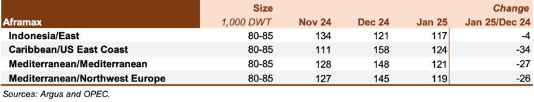 Ставки спотового фрахта Aframax продемонстрировали наибольшее снижение по сравнению с предыдущим месяцем — на 16 % в январе. По сравнению с аналогичным месяцем 2024 года спотовые ставки на танкеры Aframax снизились на 41 %.