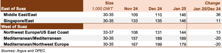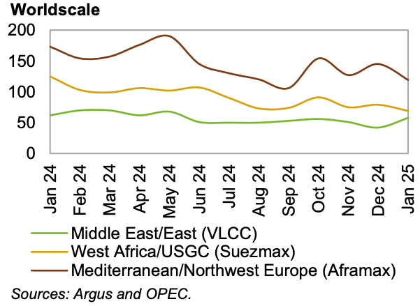 На маршруте Ближний Восток — Восток ставки в январе составили в среднем WS58, что на 38 % больше, чем в предыдущем месяце. По сравнению с аналогичным периодом прошлого года ставки снизились на 6%. На маршруте Ближний Восток-Запад ставки также выросли по сравнению с предыдущим месяцем на 21 % и составили в среднем WS35. По сравнению с тем же месяцем 2024 года ставки на этом маршруте снизились на 24%.