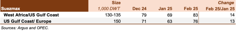 На маршруте Западная Африка — ЮГК спотовые фрахтовые ставки в феврале составили в среднем WS83, что на 20% больше, чем за аналогичный период прошлого года. Спотовые ставки были на 19% ниже по сравнению с тем же месяцем 2024 года. Ставки на маршруте USGC-Европа выросли на 21% и составили в среднем WS76, поскольку рост ставок на VLCC стимулировал переход на суда типа Suezmax. По сравнению с тем же месяцем 2024 года ставки снизились на 17 %.