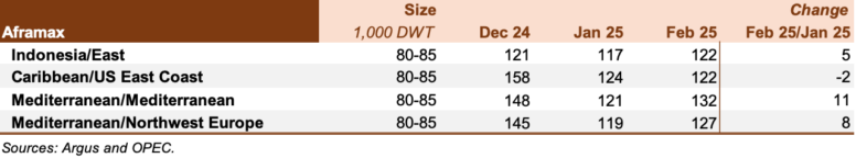 Ставки спотового фрахта Aframax продемонстрировали более скромный рост, увеличившись в феврале на 4 % по сравнению с предыдущим месяцем. По сравнению с тем же месяцем прошлого года спотовые ставки на танкеры Aframax снизились на 25 %.