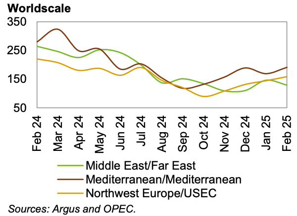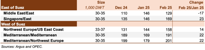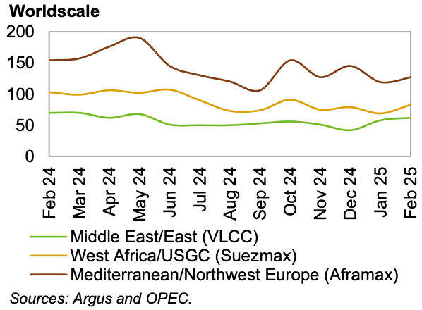 На маршруте Ближний Восток — Восток ставки в феврале составили в среднем WS62, что на 7% выше, чем в предыдущем месяце, поскольку крупные покупатели российского сорта искали альтернативные варианты после расширения санкций в отношении судов, перевозящих российскую нефть. По сравнению с предыдущим годом ставки снизились на 11%. Потоки на Запад пострадали меньше, и в результате ставки на маршруте Ближний Восток — Запад выросли на меньшие 3% по сравнению с предыдущим месяцем и составили в среднем WS36. По сравнению с тем же месяцем 2024 года ставки снизились на 31%.