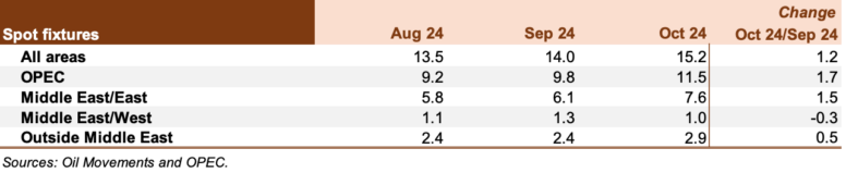 Мировые спотовые поставки в октябре еще более улучшились, составив в среднем 15,2 млн баррелей в сутки за месяц, что представляет собой рост на 1,2 млн баррелей в сутки, или около 9%, по сравнению с предыдущим месяцем. По сравнению с октябрем 2023 года мировые спотовые поставки увеличились на 0,5 млн баррелей в сутки, или на 3%. На всех отслеживаемых маршрутах наблюдался рост, за исключением маршрута Ближний Восток — Запад, который снизился на фоне ограниченных потоков в Атлантическом бассейне.