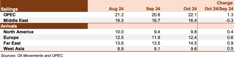 Поставки на Дальний Восток в октябре составили в среднем 14,5 млн баррелей в сутки, увеличившись на 0,9 млн баррелей в сутки, или почти на 7%. По сравнению с аналогичным периодом прошлого года объем прибытий в регион практически не изменился. Поставки в Западную Азию в октябре выросли на 0,5 млн баррелей в сутки, или примерно на 6%, по сравнению с предыдущим месяцем, составив в среднем 9,6 млн баррелей в сутки. По сравнению с тем же месяцем прошлого года поставки в регион увеличились на 2,2 млн баррелей в сутки, или примерно на 30%.
