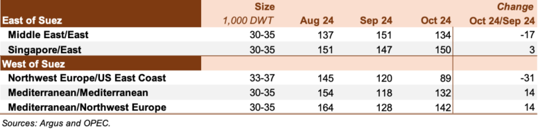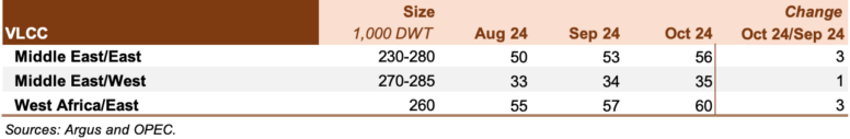 На маршруте Ближний Восток — Восток ставки спотового фрахта VLCC в октябре выросли на 6% по сравнению с предыдущим месяцем, а ставки на маршруте Западная Африка — Восток за тот же период увеличились на 5%. На рынке Suezmax ставки на маршруте США-Побережье Персидского залива-Европа подскочили на 36 % за месяц. Резкий рост ставок на суда типа Aframax стимулировал фрахтователей переключиться на крупные суда типа Suezmax, хотя достаточное количество свободных мест ограничило рост ставок. Ставки Aframax на маршруте Карибский бассейн — Восточное побережье США выросли на 81 % за месяц, восстановившись после низких уровней в предыдущем месяце, когда погодные условия ограничили спрос на танкеры. Поддержку оказал высокий спрос на американскую нефть в начале месяца на маршруте Aframax в Европу. Ставки на кросс-Медском маршруте выросли на 41% за месяц.