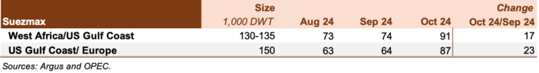 Ставки спотового фрахта Aframax выросли в октябре, причем за месяц они увеличились на всех отслеживаемых маршрутах. Наибольший рост ставок наблюдался к западу от Суэца, что было обусловлено увеличением активности на побережье Мексиканского залива в США. В среднем ставки на перевозки Aframax выросли на 41% за месяц, хотя спотовые ставки были на 8% ниже уровня, наблюдавшегося в октябре 2023 года.