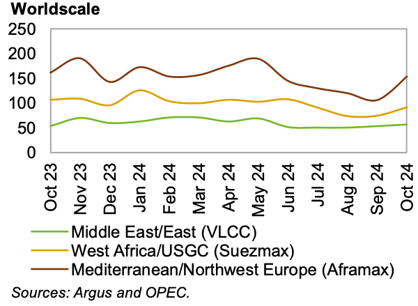 Более высокие ставки на Ближнем Востоке способствовали росту спотовых фрахтовых ставок на маршруте Западная Африка — Восток. В октябре они выросли на 5% по сравнению с предыдущим месяцем и составили в среднем WS60. По сравнению с тем же месяцем 2023 года ставки выросли на 7%.
