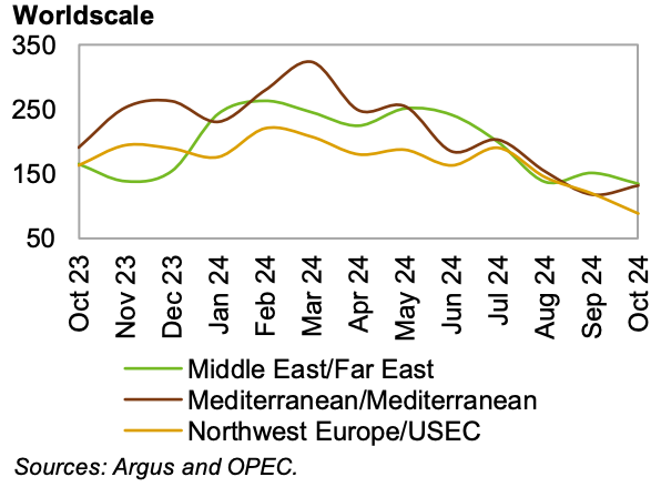 Спотовые фрахтовые ставки на маршруте СЗВ-ЮСЕК упали на 26 % за месяц из-за отсутствия традиционных потоков бензина из Европы в США. Ставки составили в среднем WS89, что на 45 % меньше, чем в октябре 2023 года.