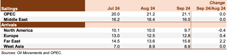 Отправки ОПЕК в целом остались на прежнем уровне в сентябре, в среднем 21,1 мб/д. Однако по сравнению с тем же месяцем в 2023 году отгрузки ОПЕК выросли на 2,4 мб/д, или почти на 13%. Отгрузки на Ближнем Востоке были незначительно выше, м-о-м, в среднем 16,5 мб/д в сентябре. В годовом исчислении отгрузки из региона снизились на 0,4 мб/д, или почти на 3%.
