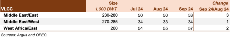 Спотовые ставки фрахта для VLCC еще больше выросли в сентябре после стагнации месяцем ранее. В среднем спотовые ставки фрахта VLCC выросли на 4% в месячном исчислении и были на 26% выше по сравнению с тем же месяцем в 2023 году.