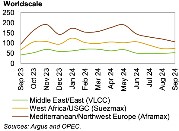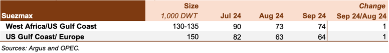 На маршруте Западная Африка-USGC ставки спотового фрахта в сентябре в среднем составили WS74, что представляет собой небольшой рост на 1% м-о-м. Ставки спотовых выросли на 10% по сравнению с тем же месяцем в 2023 году. Ставки на маршруте USGC-Европа выросли на 2% м-о-м, до среднего значения WS64. По сравнению с тем же месяцем в 2023 году они были на 28% выше.