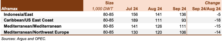 В отличие от более крупных классов, ставки фрахта на спотовые танкеры Aframax снизились на всех отслеживаемых маршрутах второй месяц подряд. В среднем ставки на Aframax снизились на 10% по сравнению с предыдущим месяцем, хотя ставки все еще были на 10% выше по сравнению с тем же месяцем прошлого года.