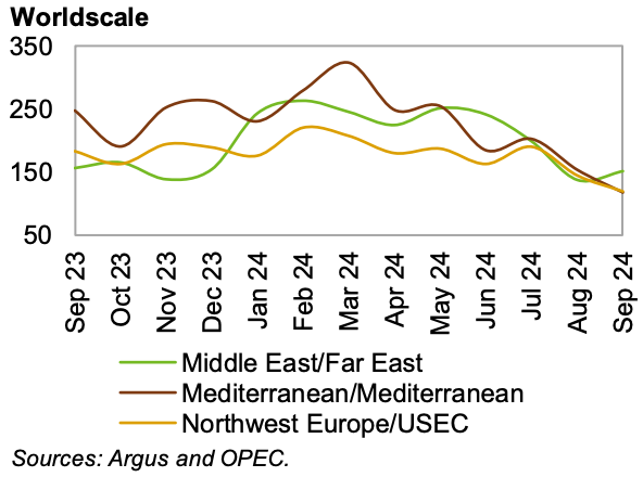 Ставки на маршруте Ближний Восток-Восток выросли на 10% в месячном исчислении, до среднего значения WS151 в сентябре. По сравнению с тем же месяцем в 2023 году ставки все еще были на 3% ниже. Чистые спотовые ставки фрахта на маршруте Сингапур-Восток упали на 3% м-м. Ставки на маршруте в среднем составили WS147, что на 36% меньше по сравнению с тем же месяцем 2023 года.