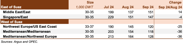 В отличие от других маршрутов, спотовые поставки на маршрутах «За пределами Ближнего Востока» снизились, упав на 0,2 мб/д, или на 10%, м/м, до среднего значения 2,2 мб/д. По сравнению с тем же месяцем 2023 года поставки снизились на 1,3 мб/д, или на 37%.