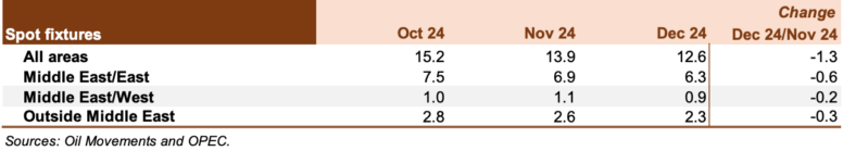 В декабре спотовые поставки на маршруте Ближний Восток — Запад упали на 0,2 млн баррелей в сутки, или примерно на 17%, по сравнению с предыдущим месяцем, и составили в среднем 0,9 млн баррелей в сутки. По сравнению с тем же месяцем прошлого года объемы поставок снизились менее чем на 0,1 млн баррелей в сутки, или примерно на 5%.