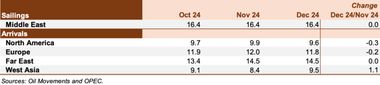 Прибытие сырой нефти было неоднородным к востоку и западу от Суэца, соответственно, наблюдалось увеличение и уменьшение. Средний объем прибытия на Дальний Восток в декабре составил 14,5 тыс. баррелей в сутки, что представляет собой незначительный рост менее чем на 1%. Однако по сравнению с предыдущим годом объем прибытий снизился на 0,5 млн баррелей в сутки, или примерно на 3%. Поставки в Западную Азию выросли на 1,1 млн баррелей в сутки, или на 13 %, и составили в среднем 9,5 млн баррелей в сутки. По сравнению с тем же месяцем прошлого года поставки в регион выросли на 1,9 млн баррелей в сутки, или почти на 26 %.