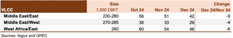 На маршруте Ближний Восток — Восток ставки спотового фрахта VLCC в декабре упали на 18 %, в то время как ставки на маршруте Западная Африка — Восток снизились на 11 %.