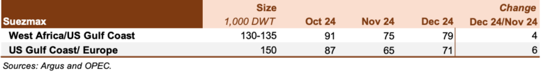 На маршруте Западная Африка — ЮСГК спотовые фрахтовые ставки в декабре составили в среднем WS79, что означает рост на 5% по сравнению с предыдущим годом. Спотовые ставки все еще были на 17% ниже по сравнению с тем же месяцем 2023 года. Ставки на маршруте USGC-Европа продемонстрировали более значительный рост, увеличившись на 9% до среднего значения WS71. По сравнению с тем же месяцем 2023 года ставки также были на 17% ниже.