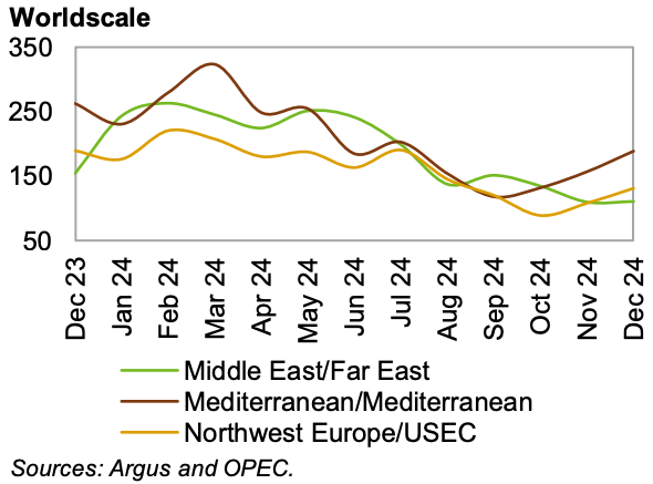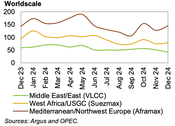 На маршруте Ближний Восток — Восток ставки в декабре составили в среднем WS42, снизившись на 18 % по сравнению с предыдущим месяцем. По сравнению с предыдущим годом ставки снизились на 29 %. На маршруте Ближний Восток — Запад в декабре также был зафиксирован убыток, снизившись на 12 % по сравнению с предыдущим месяцем и составив в среднем WS29. По сравнению с тем же месяцем 2023 года ставки на этом маршруте упали на 22 %.