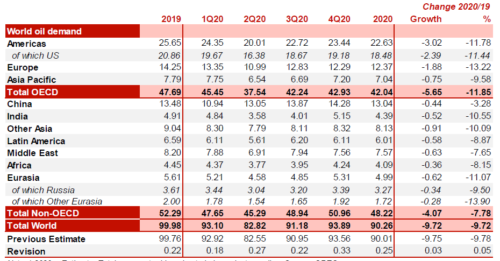 В данный момент указывается, что спрос на нефть в мире в 2020 году сократился на 9.7 млн. баррелей в день до 90.3 млн. баррелей в день.