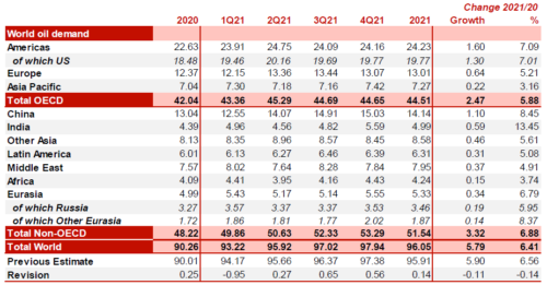 Прогноз по росту спроса на нефть в странах ОЭСР в 2021 году составляет 2.5 млн. баррелей в день.