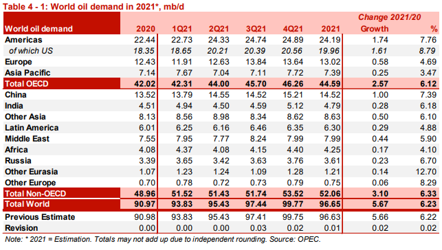Таблица 4-1. Мировой спрос на нефть в 2021, млн б/д