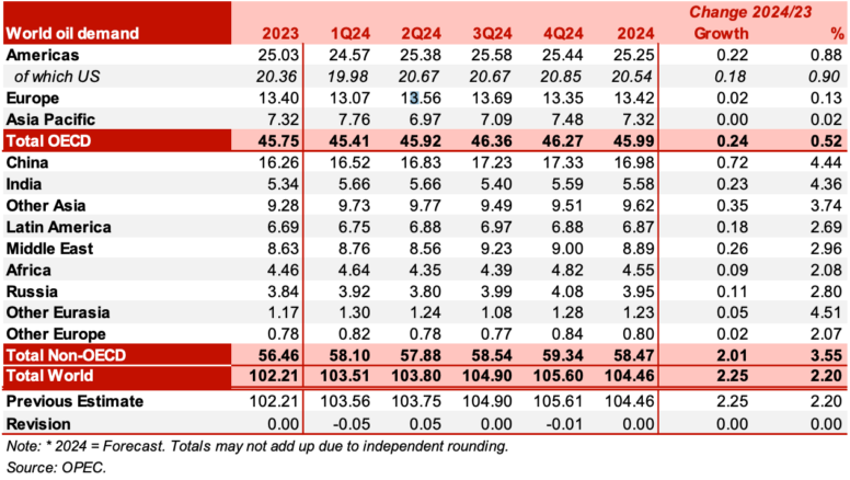 Ожидается, что общий мировой спрос на нефть достигнет 104,5 млн баррелей в сутки в 2024 году, чему будет способствовать высокий спрос на авиаперевозки и здоровая автомобильная мобильность, включая грузовые перевозки. Ожидается также поддержка со стороны промышленной, строительной и сельскохозяйственной деятельности в странах, не входящих в ОЭСР.