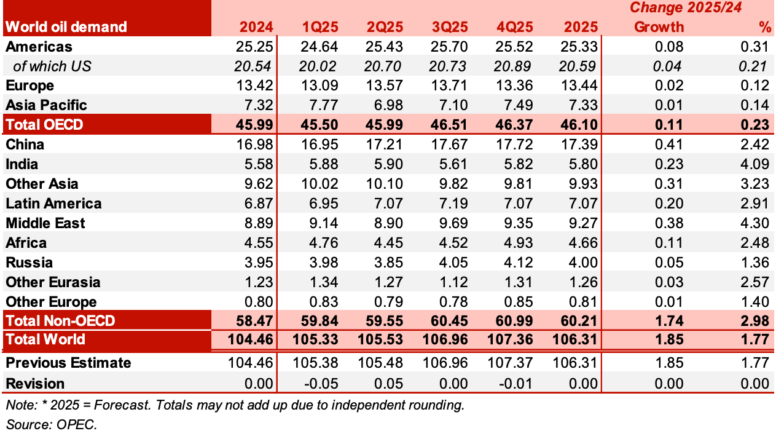 Прогнозируется, что в 2025 году мировой спрос на нефть продолжит демонстрировать устойчивый рост на 1,8 млн баррелей в сутки по сравнению с аналогичным периодом прошлого года, не изменившись по сравнению с оценкой предыдущего месяца. Ожидается, что в странах ОЭСР рост составит 0,1 млн баррелей в сутки по сравнению с аналогичным периодом прошлого года, в то время как спрос в странах, не входящих в ОЭСР, увеличится на 1,7 млн ​​баррелей в сутки.