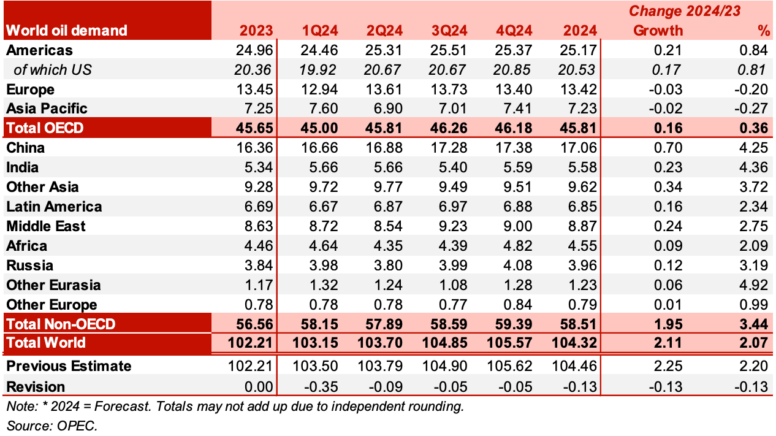 Ожидается, что общий мировой спрос на нефть достигнет 104,3 мб/д в 2024 году, чему будет способствовать высокий спрос на авиаперевозки и дорожную мобильность, включая грузоперевозки, а также здоровая промышленная, строительная и сельскохозяйственная деятельность в странах, не входящих в ОЭСР. Прогноз глобального роста зависит от многих неопределенностей, включая мировые экономические события.