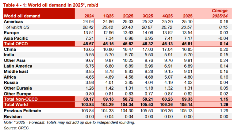 В ОЭСР прогнозируется, что в 2025 году спрос на нефть увеличится примерно на 0,1 млн баррелей в сутки в годовом исчислении, в основном за счет Северной и Южной Америки, в то время как в Европе прогнозируется незначительный рост по сравнению с аналогичным периодом прошлого года, а в Азиатско-Тихоокеанском регионе ожидается незначительный спад. В странах, не входящих в ОЭСР, прогнозируется рост спроса на нефть примерно на 1,2 млн баррелей в сутки в годовом исчислении, в основном за счет других стран Азии, Китая и Индии.