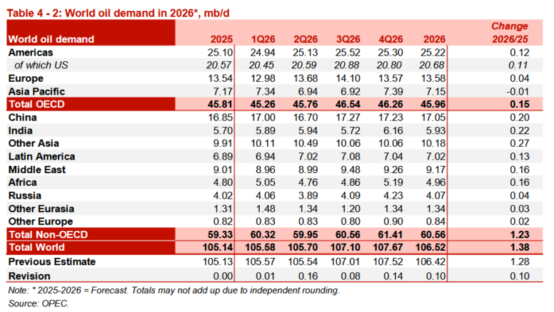 Прогноз роста мирового спроса на нефть в 2026 году пересмотрен в сторону повышения примерно на 0,1 млн баррелей в сутки в годовом исчислении до 1,4 млн баррелей в сутки в годовом исчислении на фоне ожидаемого улучшения экономических показателей в странах ОЭСР — Америка, ОЭСР-Европа, а также на Ближнем Востоке и в Африке. Ожидается, что спрос на нефть в странах ОЭСР увеличится примерно на 0,2 млн баррелей в сутки по сравнению с аналогичным периодом прошлого года, причем лидирующую роль в этом росте, как ожидается, сыграет Северная и Южная Америка. В странах, не входящих в ОЭСР, спрос на нефть, по прогнозам, увеличится на 1,2 млн баррелей в сутки, лидируют другие страны Азии, за ними следуют Индия и Китай.
