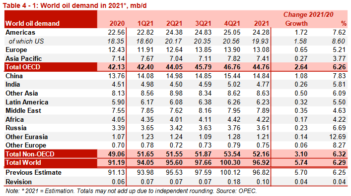 Таблица 4-1. Мировой спрос на нефть в 2021, млн б/д
