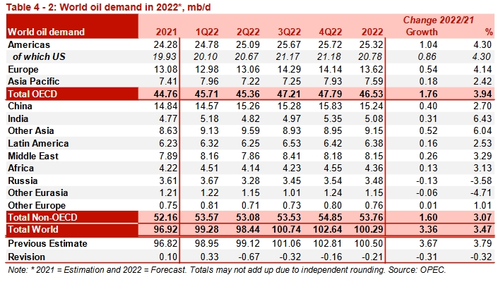 Рост мирового спроса на нефть в 2021 году был пересмотрен в сторону повышения на 0,04 млн баррелей в день (б/д) до 5,7 млн б/д. В 2021 году спрос на нефть в странах ОЭСР увеличился на 2,6 млн б/д, в то время как спрос на нефть в странах, не входящих в ОЭСР, вырос на 3,1 млн б/д в годовом исчислении. В 2022 году рост спроса на нефть был пересмотрен вниз на 0,3 млн б/д до среднего уровня 3,4 млн б/д. Прогноз был с учетом потенциального снижения мирового ВВП и распространения COVID-19 в Китае и его влияния на мировой спрос на нефть.