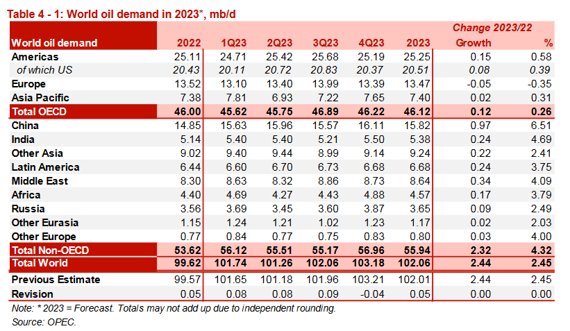 Таблица 4-1. Мировой спрос на нефть в 2023, млн б/д