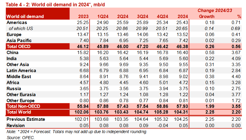 Таблица 4-2. Мировой спрос на нефть в 2024, млн б/д