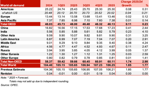 Ожидается, что в 2025 году мировой спрос на нефть вырастет на 1,8 млн баррелей в сутки по сравнению с аналогичным периодом прошлого года. Ожидается, что в странах ОЭСР рост составит 0,1 млн баррелей в сутки по сравнению с аналогичным периодом прошлого года, в то время как спрос в странах, не входящих в ОЭСР, увеличится на 1,7 млн баррелей в сутки.