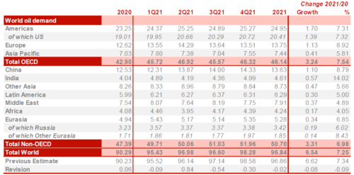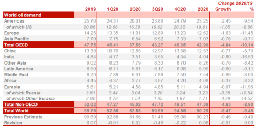 Прогноз по спросу на нефть в странах ОЭСР в 2020 году был пересмотрен в сторону снижения на 0.06 млн. баррелей в день. Вместе с тем, прогноз по спросу на нефть в странах, не входящих в ОЭСР, был пересмотрен в сторону увеличения на 0.05 млн. баррелей в день.