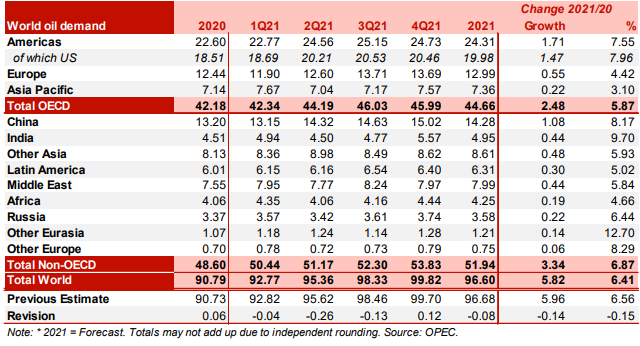 Ожидается, что в текущем году мировое потребление нефти составит 96,6 млн баррелей в день. В странах ОЭСР спрос был пересмотрен в сторону понижения более чем на 0,11 млн баррелей в день в 2021 году. Более низкие, чем ожидалось, данные о спросе за первый и второй кварталы 2021 в странах ОЭСР Северной и Южной Америки и ОЭСР в Европе, были вызваны более низким, чем ожидалось, спросом на транспорт и промышленное топливо.