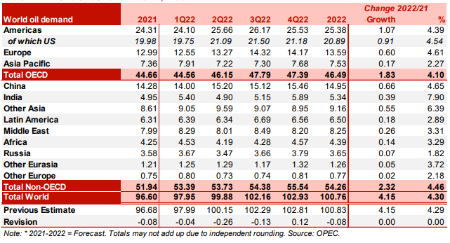 В 2022 году рост мирового спроса на нефть не изменился по сравнению с оценкой прошлого месяца и остается на уровне 4,2 млн баррелей в день. Ожидается, что общий мировой спрос на нефть за год достигнет 100,8 млн баррелей в день. Основное предположение о спросе на нефть остается таким, как было подчеркнуто в отчете за предыдущий месяц, при хорошем экономическом росте в основных странах-потребителях и более эффективном мониторинге COVID-19. На 2022 год прогноз спроса на нефть учитывает рост экономической активности на 4,2% при хорошем управлении рисками, связанными с пандемией COVID-19, благодаря более высокому уровню вакцинации и лучшему лечению. Что касается нефтепродуктов, то, по оценкам, больше всего вырастут бензин и дизельное топливо, чему способствуют продолжающееся восстановление мобильности и улучшение производственной деятельности.