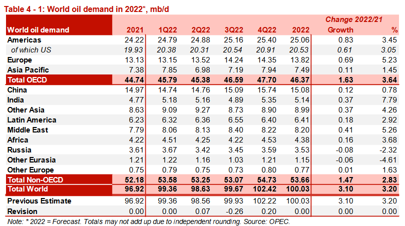 Общий спрос на нефть прогнозируется в среднем на уровне 100,0 млн б/д в 2022 году. Ожидается, что в регионе ОЭСР спрос на нефть вырастет на 1,6 млн б/д до 46,4 млн б/д в годовом исчислении. Ожидается, что спрос в странах ОЭСР в Северной и Южной Америке вырастет больше всего в 2022 году во главе с США на фоне восстановления спроса на бензин и дизельное топливо. Легкие дистилляты также поддержат рост спроса в этом году.