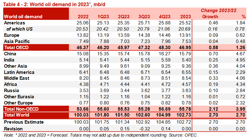 В 2023 году ожидания мирового экономического роста в сочетании с улучшениями в сдерживании распространения COVID-19 в Китае приведут к росту потребления нефти. Прогноз спроса на 2023 год остается на уровне 2,7 млн б/д, не изменившись по сравнению с последним отчетом, и достигнет 102,73 млн б/д. Ожидается, что в странах ОЭСР спрос на нефть вырастет на 0,6 млн баррелей.