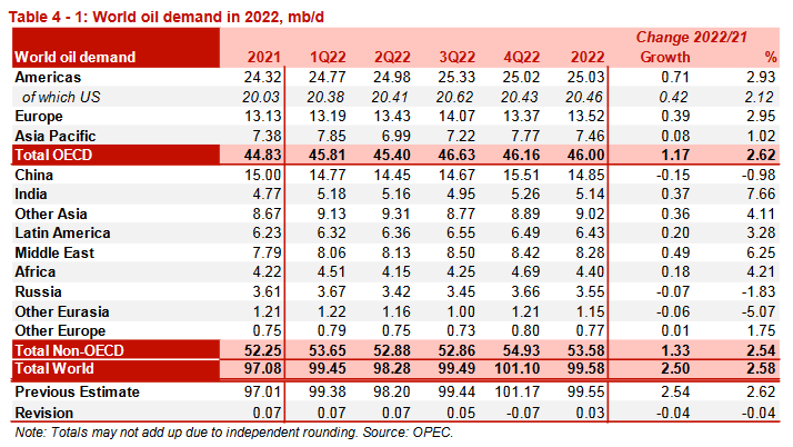Таблица 4-1. Мировой спрос на нефть в 2022, млн б/д