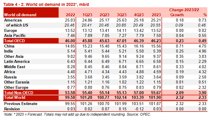 Таблица 4-2. Мировой спрос на нефть в 2023, млн б/д