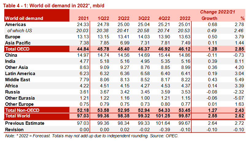 Рост мирового спроса на нефть в 2022 году был пересмотрен в сторону понижения на 0,1 млн б/д по сравнению с оценкой прошлого месяца. В настоящее время спрос прогнозируется на уровне 2,5 млн б/д в годовом исчислении, что отражает наблюдаемые тенденции и события в различных регионах.