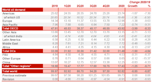 В странах, не входящих в ОЭСР, спрос на нефть в 2020 году был пересмотрен в сторону снижения на 3.2 млн. баррелей в день.