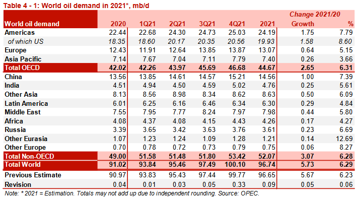 Таблица 4-1. Мировой спрос на нефть в 2021, млн б/д