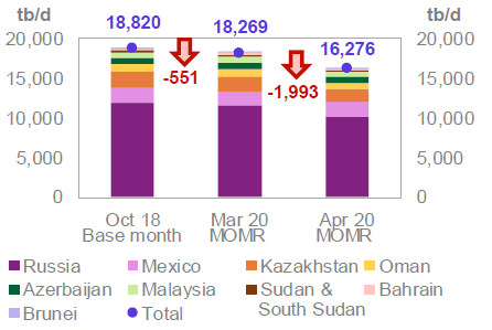 Прогноз по нефтедобыче для стран, не входящих в ОПЕК, но согласившихся принять участие в стабилизации рынка посредством добровольного ограничения нефтедобычи в 2020 году, был пересмотрен в сторону снижения на 2 млн. баррелей в день.