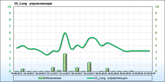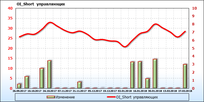 Открытый интерес управляющих активами без учета объема торговцев занимающих противоположные позиции по фьючерсным контрактам с разной датой экспирации вырос на 2 тысячи контрактов. Объем контрактов, направленных как правило на спекуляции, составляет 40 973 штуки. Деньги управляющих в течение прошлой недели приходили на рынок поддерживая тенденцию.