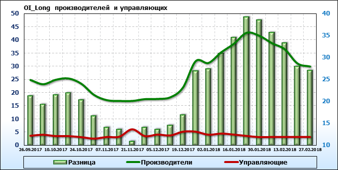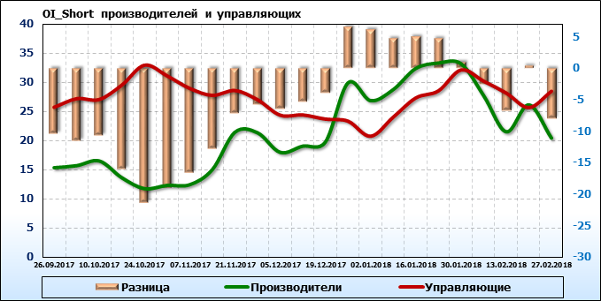 За прошедшую неделю разница между OI производителей и OI управляющих сократилась на 9 763 контракта. Разница между длинными позициями производителей и управляющих сократилась на 925 контрактов. Разница между короткими позициями производителей и управляющих сократилась на 8 450 контрактов.